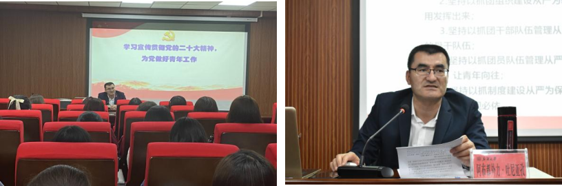 阿布都外力·吐尼亚孜老师从学习宣传贯彻党的二十大精神,为党做好青年工作和新时代青年要做坚定的马克思主义者开展了此次授课。阿布都外力·吐尼亚孜老师对我们提出了以下几个方面的内容:一是新时代青年要坚定信仰马克思主义,深刻认识历史和人民怎样选择了马克思主义、选择了中国共产党、选择了社会主义道路、选择了改革开放,不断深化对马克思主义历史必然性和科学真理性、理论意义和现实意义的认识;二是自觉践行马克思主义,做知行合一、担当作为的实干家。三是讲好马克思主义中国化故事,守好意识形态阵地,坚决同一切反马克思主义的错误思潮作斗争,为巩固马克思主义在意识形态领域的指导地位、巩固全党全国人民团结奋斗的共同思想基础做贡献。