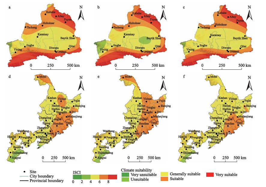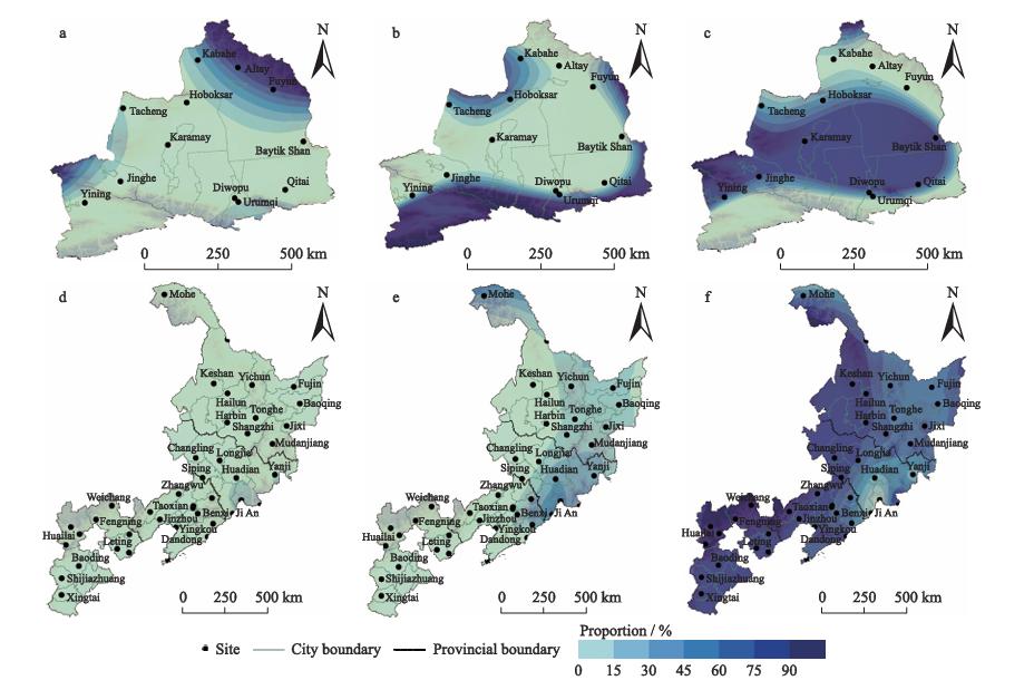 图2 1991年至2021年,中国新疆北部(a、b、c)、河北、黑龙江、吉林和辽宁(d、e、f)“非常合适”、“合适”和“一般合适”年份比例的空间分布