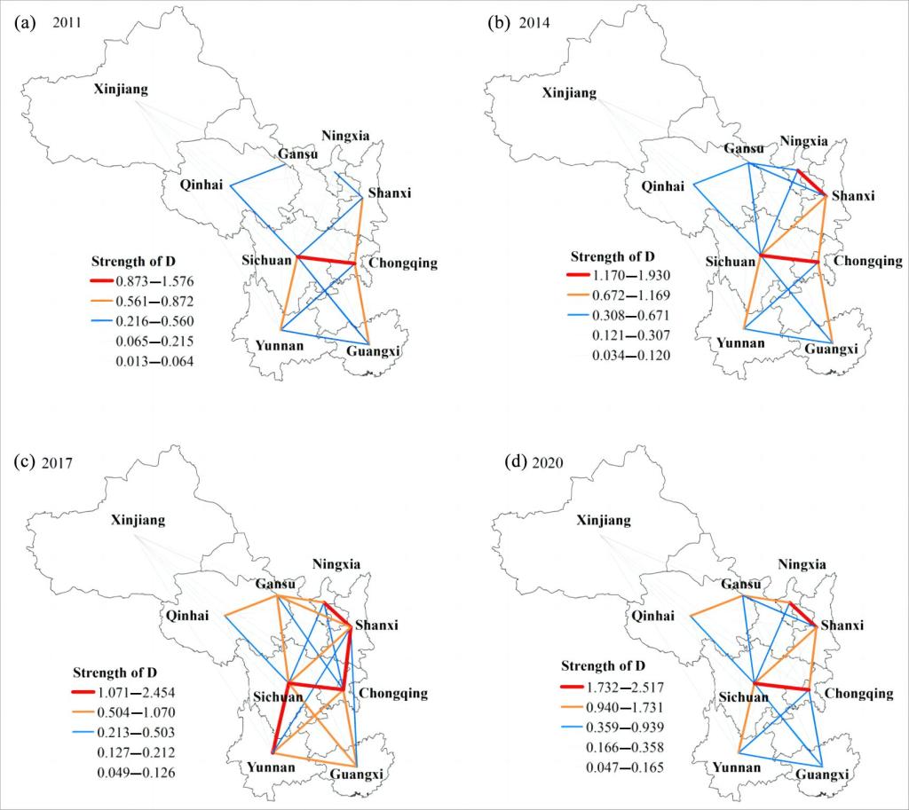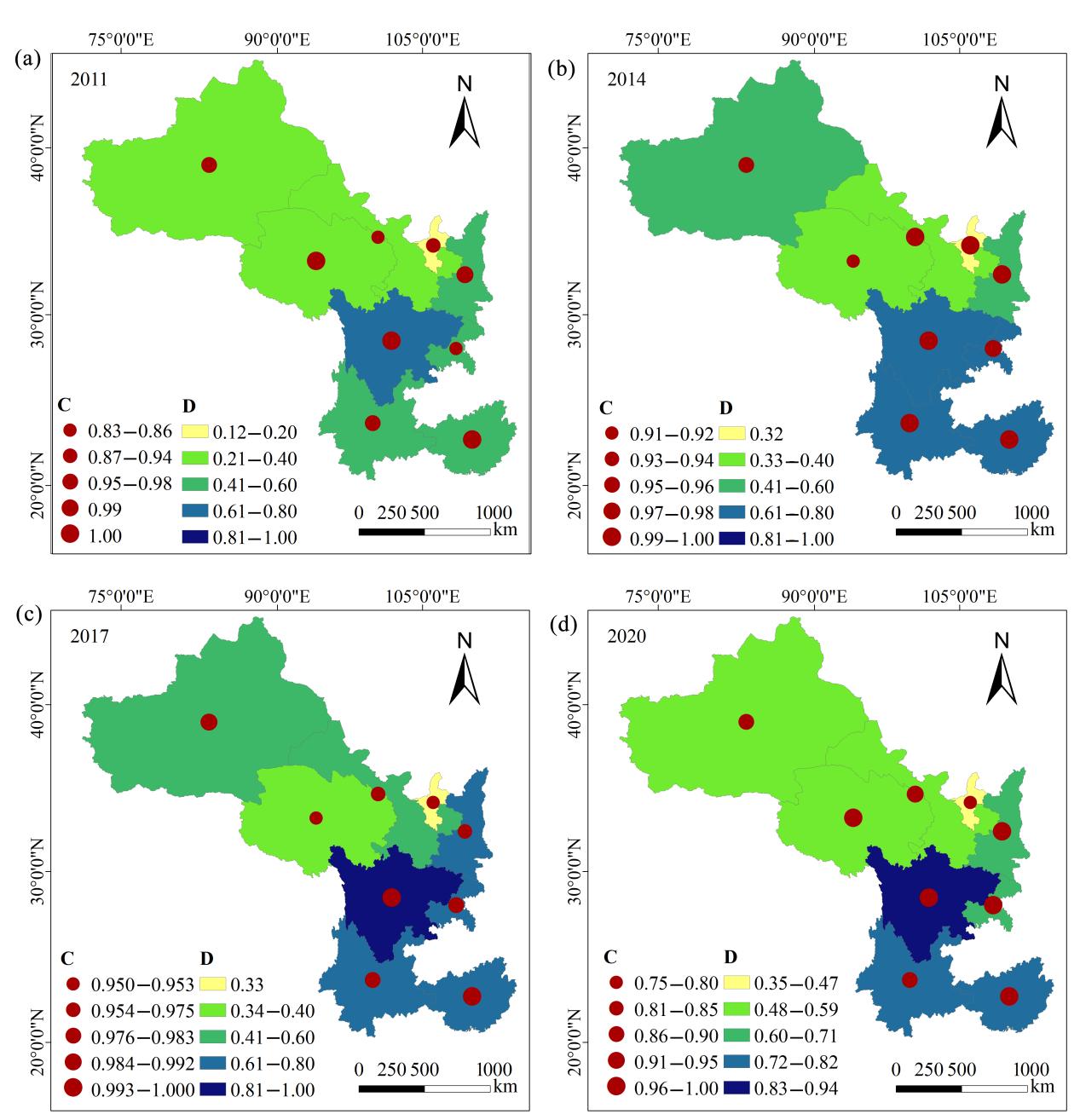 D in 2011; (b) C and D in 2014; (c) C and D in 2017; (d) C and D in 2020.