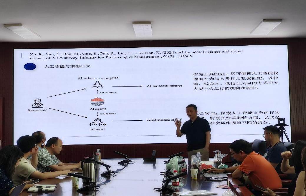 梁增贤教授提出作为工具的AI,尽可能使人工智能代理的行为与人类行为紧密匹配,以快速、低成本、低伦理风险的方式研究人类社会运行的机制和规律;同时,也要关注社会实体,探索人工智能自身的行为特别关注其独特方面,尤其是社会运作规律不同的部分。梁增贤教授深入剖析了AI技术对旅游学科研究范式、方法论及伦理议题的深刻影响,结合旅游领域的典型案例,生动阐释了跨学科研究的必要性,引发了在场师生的强烈共鸣。