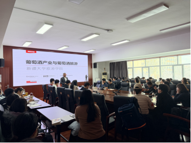 随后,潘家佳博士围绕《葡萄酒产业与葡萄酒旅游》主题展开第二场讲座。他结合葡萄酒产业的发展历史及现状,详细介绍了葡萄酒产业与五个结构性矛盾以及发展葡萄酒旅游的目的。潘博士指出,我国拥有十八处葡萄酒产区有着得天独厚的葡萄种植与葡萄酒酿造资源,发展葡萄酒旅游不仅能推动葡萄酒产业的升级,更能为我国旅游产业注入新的活力,其引人入胜的讲解为在场师生打开了葡萄酒产业与旅游融合发展的思路。