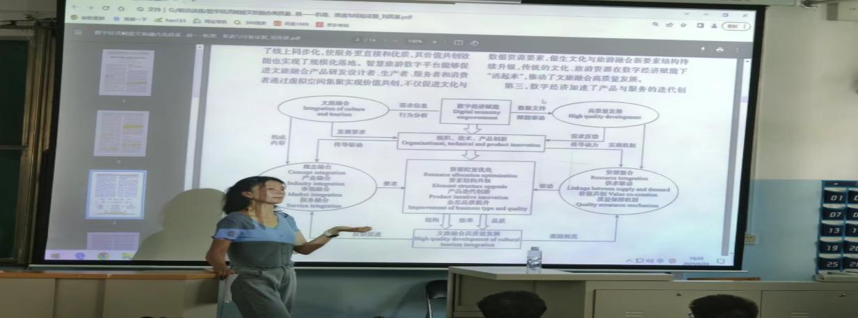 通过《数字经济赋能文旅融合高质量发展--机理、渠道与经验数据》一文,讲解如何通过一篇文章的题目和摘要了解文章的研究对象、主要的研究方法和研究目的。借用《人工智能聊天机器人角色对顾客情感依赖的影响研究》一文讲解了论文摘要部分如何进行书写。摘要部分包括研究背景、以往研究的不足、研究的结论。老师引导员工详细阅读了《数字经济赋能文旅融合高质量发展--机理、渠道与经验数据》一文,详细解读了文章的结构和数字经济促进文旅融合高质量发展的逻辑和传导机制图。